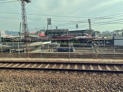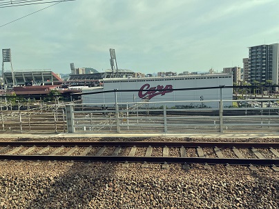 新幹線に乗りました。これが車窓から見たマツダスタジアムです。いよいよ広島ともお別れです。2泊3日の旅行でしたが、見どころ満載でいい旅でした。原爆ドーム、厳島神社、弥山、マツダスタジアムでのプロ野球観戦、その後に行った焼き鳥屋、広島城、そして泊ったアパホテル広島駅前大橋と、全て良かったです。