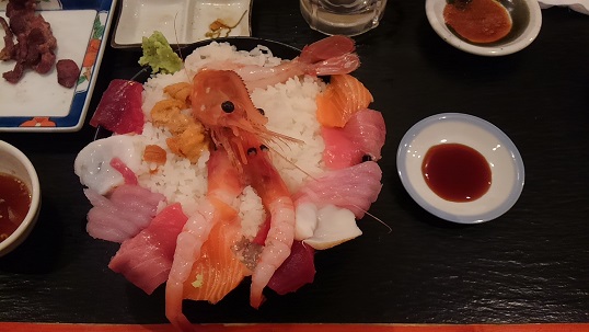 友人は既に一杯やっており、私も漸く札幌ビールにありつけました。カウンター越しには愛想のいいお兄さんがきりもりしており、手際よくイカを捌いていました。先程の屋根の理由もこのお兄さんから聞けました。イカ、ジンギスカン、ホッケ等をつまみました。最後に楽しみにしていた海鮮丼を食べました。