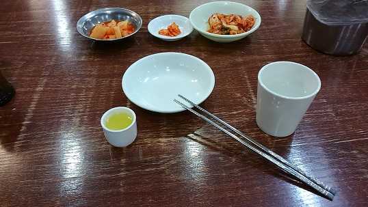 最初にキムチが出てきます。手前のはお茶ではなく、参鶏湯に入れるそうです。箸は金属でした。