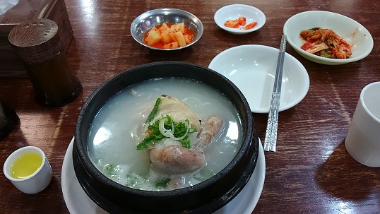 百済参鶏湯に一人で入りました。店の中には適度に客がいてすぐに座れました。参鶏湯を注文しますと、先にキムチを持ってきてくれました。暫く経ってから参鶏湯が出てきました。