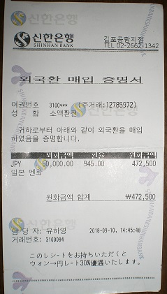 100円が945Wとして両替されます。その時の相場は100円が1000W以上でしたので、5%以上の為替手数料が発生することになります。Tmoneyカードとolleh WiFiの購入