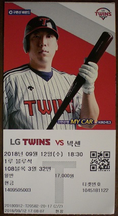 この日はネクセンヒーローズがリードしていましたが、土壇場でLGツインズが同点に追いつき、延長10回の末にLGツインズが5−4で勝ちました。実は21:00を回ったところ(9回が終わったところ)で球状を後にしてしまったのですが、十分に楽しめました。結果はホテルへ戻ってからテレビで知りました。