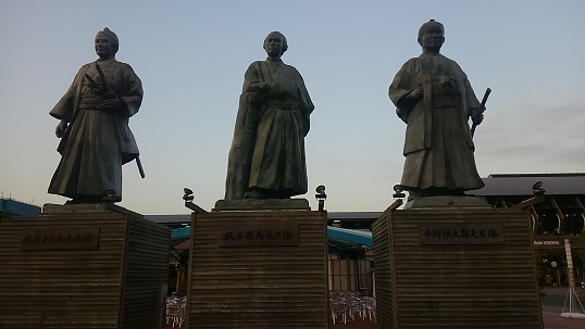 空港から高知駅までは約30分少々でした。駅前では大きな像が3体ありました。左より武市半平太、坂本竜馬、中岡慎太郎の像です。中々インパクトがあって、これを見るとさすがに高知に来たなという感じでした。